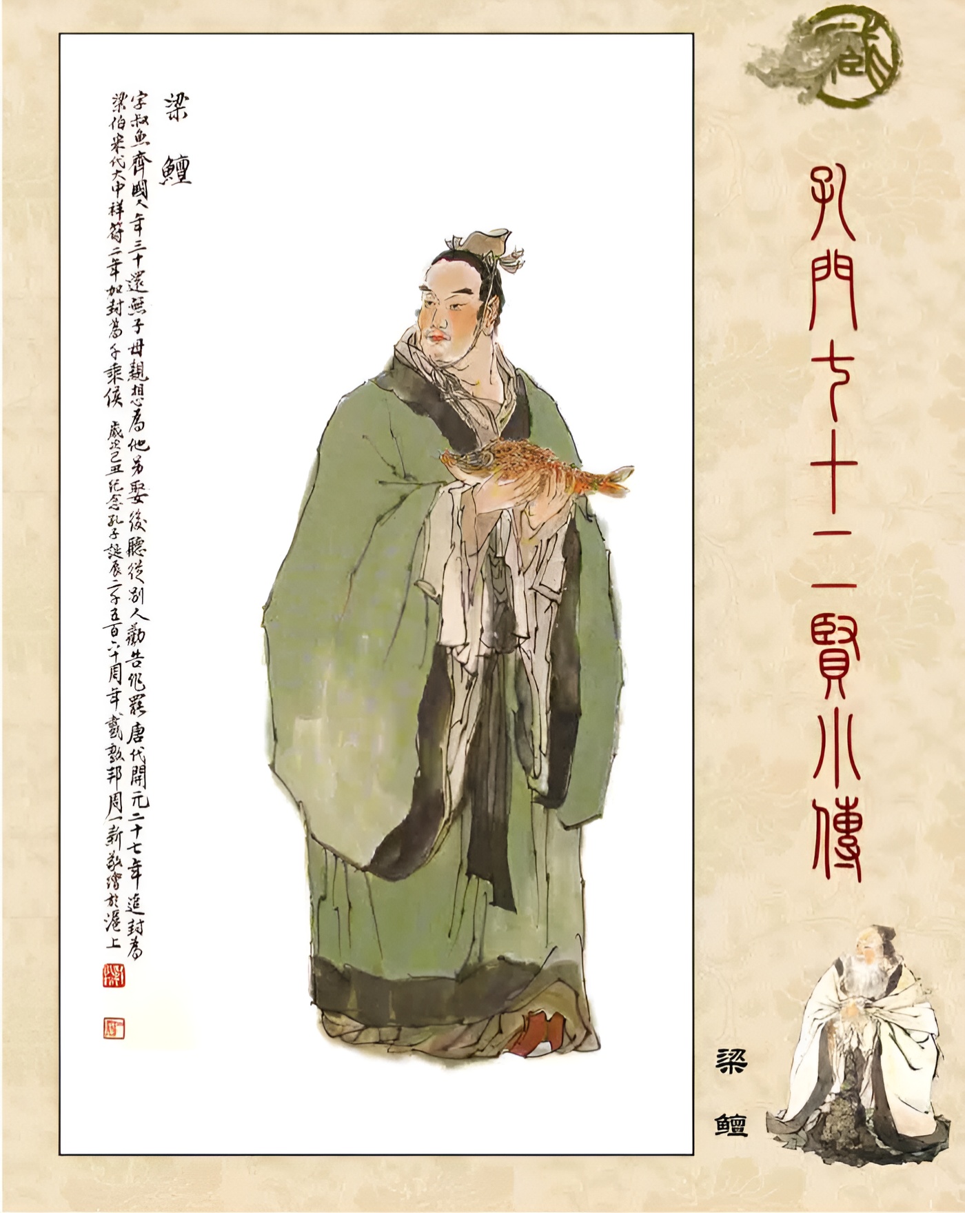 梁鳣系梁康伯九世孙,又名叔鱼,生活在春秋末和战国初(前522年-公元前440年),徙居山东曲阜,师从孔子,周游列国,比孔子少二十九岁,列孔子七十二贤之三十位,追封子京侯、加封千乘候,又称“先贤梁子”。梁鳣公是中国梁氏族史中有文字可查、有真实坟冢(今山东东平县梁林,梁林是中国历史上著名的家族陵林)的最重要先祖,也是梁姓族人在初期发展阶段世系的骨干脉系。鳣公十二世孙金玉生屏、潘二子,潘生观、仓二子。